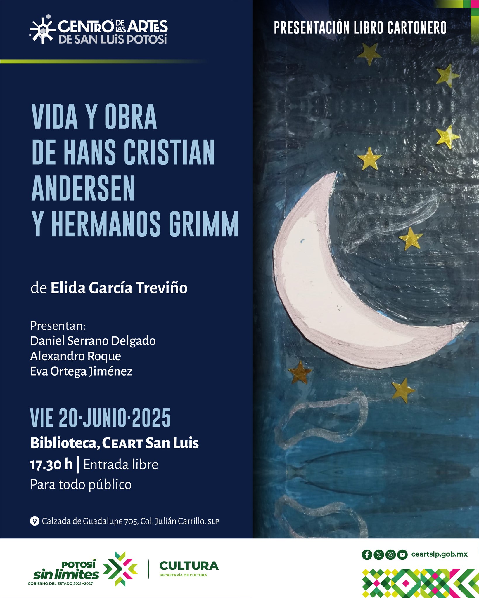 Hoy viernes te esperamos en la presentación del libro cartonero «Vida y obra de Hans Cristian Andersen y hermanos Grimm» de Elida García Treviño donde contaremos con los comentarios de Daniel Serrano Delgado, Alexandro Roque y Eva Ortega Jiménez.
