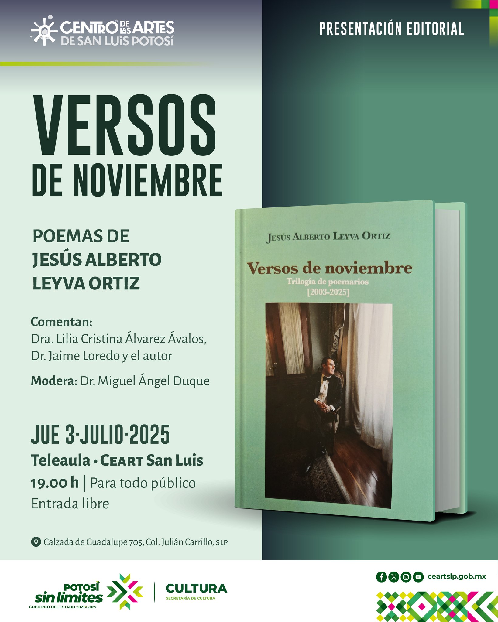 Este próximo jueves te esperamos en la presentación editorial de «Versos de noviembre», poemas de Jesús Alberto Leyva Ortiz, con los comentarios de la Dra. Lilia Cristina Álvarez Ávalos, del Dr. Jaime Loredo y del propio autor, modera el Dr. Miguel Ángel Duque.