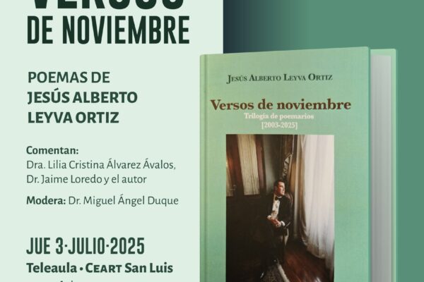 Este próximo jueves te esperamos en la presentación editorial de «Versos de noviembre», poemas de Jesús Alberto Leyva Ortiz, con los comentarios de la Dra. Lilia Cristina Álvarez Ávalos, del Dr. Jaime Loredo y del propio autor, modera el Dr. Miguel Ángel Duque. Jueves 3 de julio 19:00 horas Teleaula del #CeartSanLuis Entrada libre/Para todo…