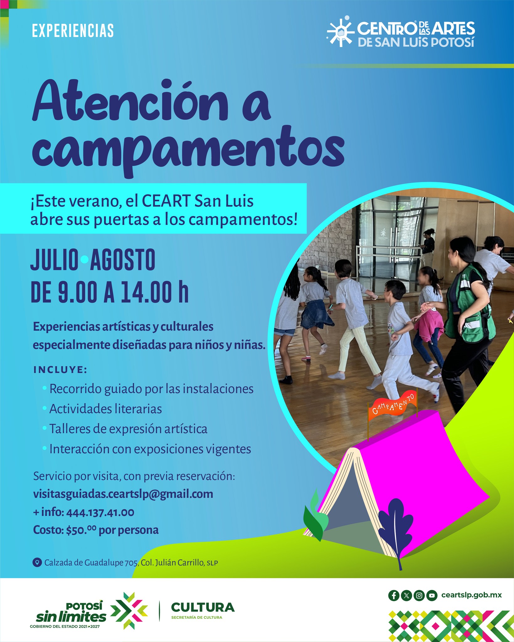 Servicio disponible por visita, con previa reservación al correo electrónico visitasguiadas.ceartslp@gmail.com. Para mayor información al tel. 444 137 4100.