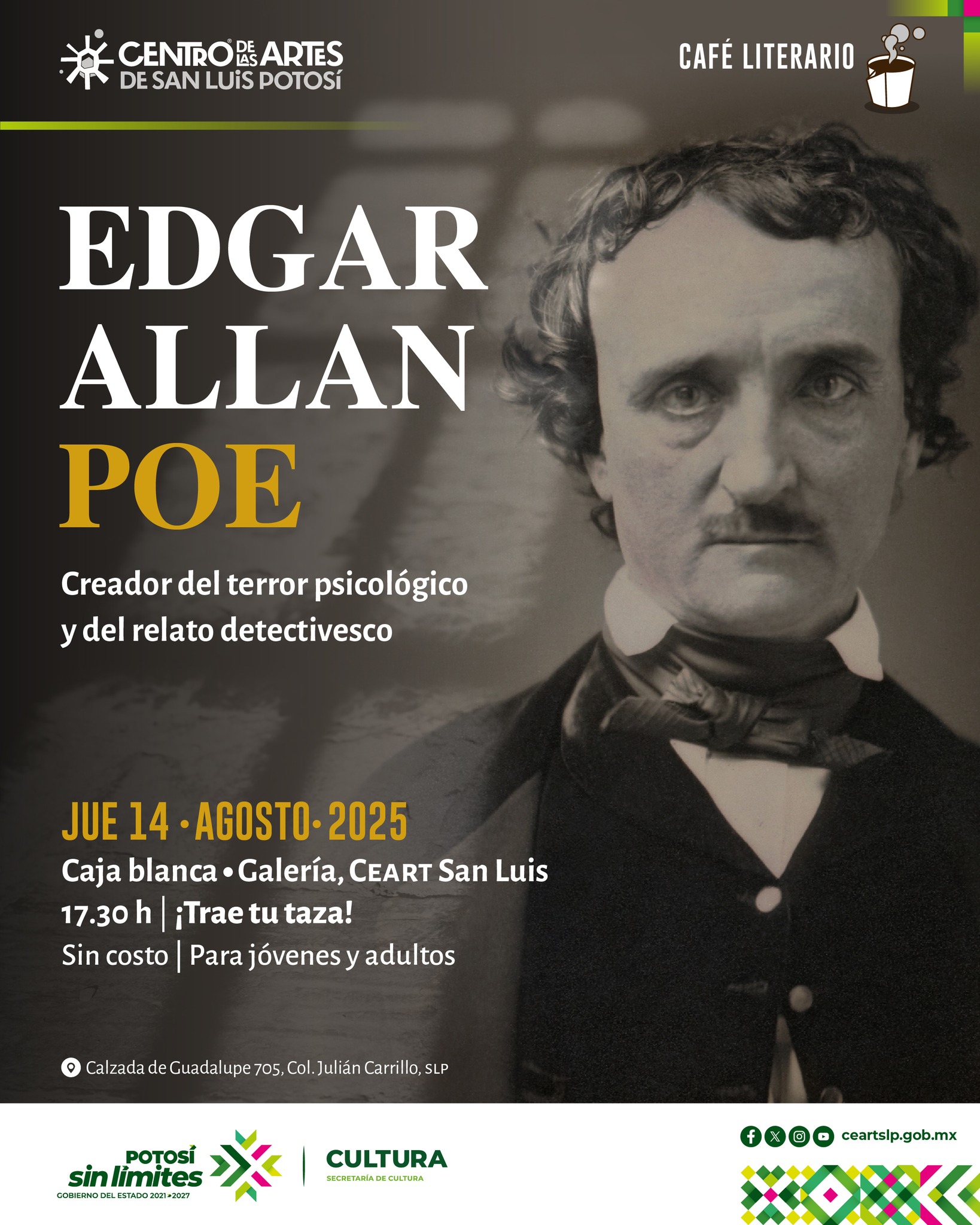 Hoy te esperamos en nuestro tradicional Café literario que presenta en esta ocasión el tema : «Edgar Allan Poe, creador del terror psicológico y del relato detectivesco» imparte Victoria Cabrera Beck.