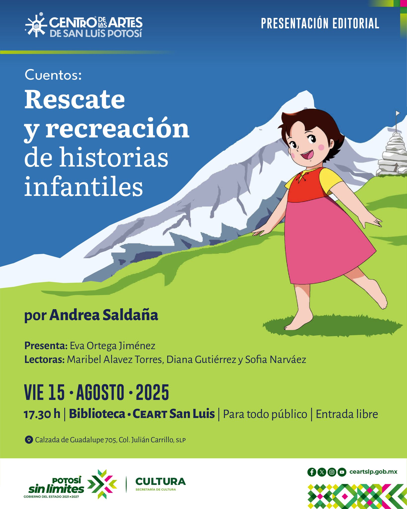 Te esperamos hoy en la presentación editorial de cuentos: rescate y recreación de historias infantiles por Andrea Saldaña. Presenta Eva ortega Jiménez, Lectoras: Maribel Alavez Torres, Diana Gutiérrez y Sofía Narváez.