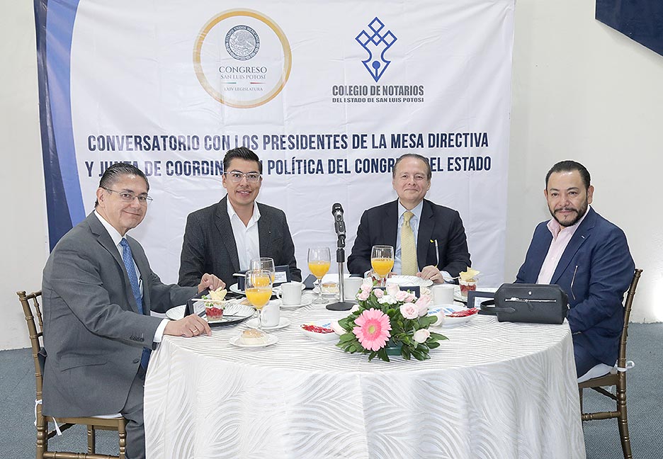 Con el propósito de generar una mayor participación que permita trabajar en reformas o la creación de una nueva Ley del Notariado en San Luis Potosí, los diputados Héctor Serrano Cortés, presidente de la Junta de Coordinación Política (Jucopo) y Cuauhtli Fernando Badillo Moreno, presidente de la Directiva del Congreso del Estado, participaron en un Conversatorio con integrantes del Colegio de Notarios de San Luis Potosí.