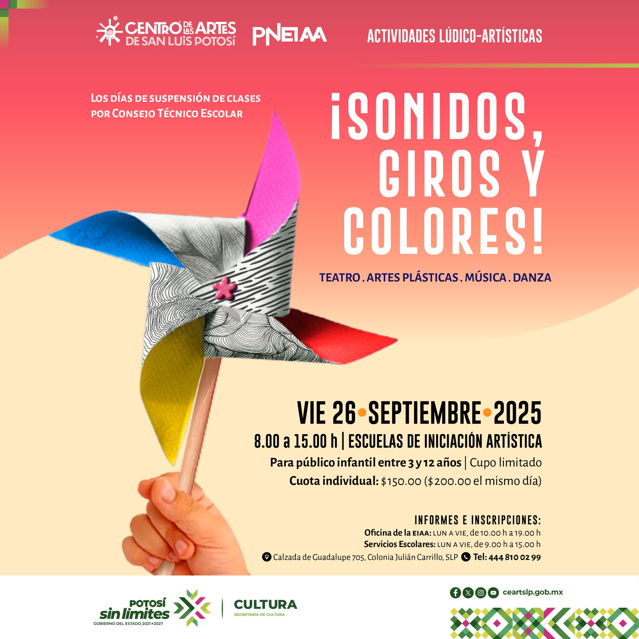 Recuerda que este viernes tenemos para los pequeñines del hogar «Sonidos, giros y colores» en las Escuelas de Iniciación Artística Asociadas, habrá actividades de teatro, artes plásticas, música y danza, recuerda que es día de Consejo Técnico Escolar y NO HAY CLASES!!!!