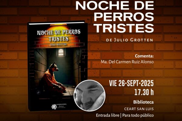 Hoy te esperamos en la Presentación del libro cartonero NOCHE DE PERROS TRISTES de Julio Grotten con los comentarios de Ma. del Carmen Ruiz Alonso. Viernes 26 de septiembre 17:30 horas Biblioteca del #CeartSanLuis Para todo público/Entrada libre #CEARTSLP#ceart2025#CulturaSinLímites#PotosíSinLímites#CulturaSLP#SecretaríadeCulturaSLP#RicardoGallardo