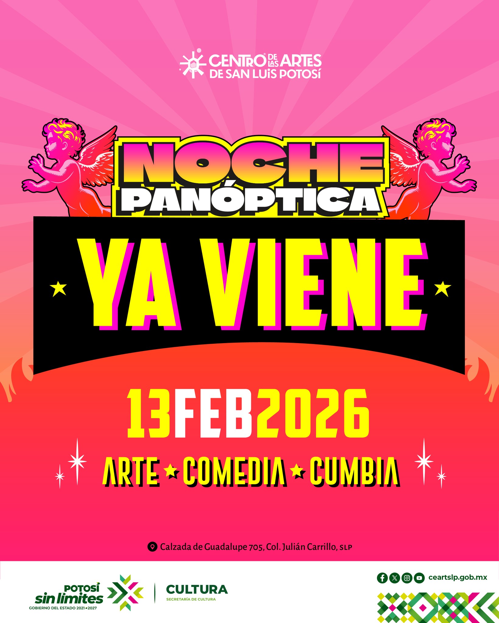 Ve agendado tu presencia en la primera edición de este año de la Noche Panóptica del #CeartSanLuis , la cita es este próximo 13 de febrero, tendremos arte, comedía y música.